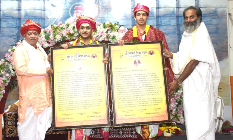 सातारा- वेदमूर्ती श्रीनिधी धायगुडे व वेदमूर्ती देवव्रत रेखे यांचा मानपत्र देऊन सत्कार करताना वेदमूर्ती विवेक शास्त्री गोडबोले ,समर्थ भक्त योगेशबुवा रामदासी (छाया : अतुल देशपांडे)