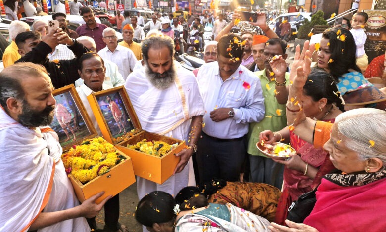 सातारा – येथील पोवई नाका परिसरात श्री समर्थ रामदास स्वामींच्या पादुकांचे पंचारतींनी औक्षण करताना सुवासिनी. (छाया : अतुल देशपांडे)
