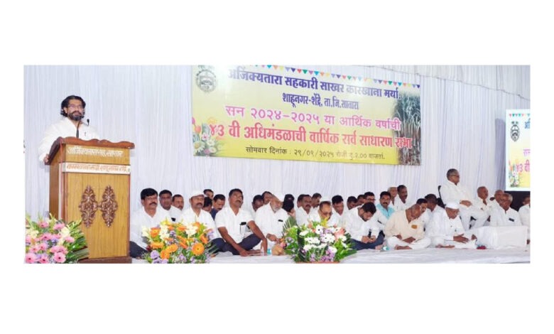 शेंद्रे ता. सातारा येथील स्व. अभयसिंहराजे भोसले सांस्कृतिक हॉल येथे अजिंक्यतारा सहकारी साखर कारखान्याची 43 वी वार्षिक सर्वसाधारण सभा खेळीमेळीच्या वातावरणात, मोठ्या उत्साहात संपन्न झाली. या सभेत ना. शिवेंद्रसिंहराजे बोलत होते. यावेळी कारखान्याचे चेअरमन यशवंत साळुंखे, व्हा. चेअरमन नामदेव सावंत, कार्यकारी संचालक जिवाजी मोहिते, सर्व आजी, माजी संचालक, जिल्हा परिषदेचे माजी उपाध्यक्ष चंद्रकांत जाधव, माजी सभापती सतीश चव्हाण, वनिता गोरे, सातारा जिल्हा मध्यवर्ती सहकारी बँकेचे संचालक सौ. कांचन साळुंखे, सुरेश सावंत आदी मान्यवरांची प्रमुख उपस्थिती होती. यावेळी कमी क्षेत्रात उच्चांकी उत्पादन घेणार्या आणि कारखान्यास विक्रमी ऊस पुरवठा करणार्या शेतकर्यांचा रोख रक्कम, स्मृतिचिन्ह देऊन मान्यवरांच्या हस्ते गौरव करण्यात आला.