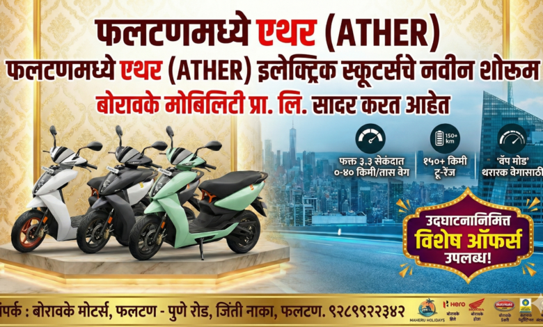 पेट्रोलच्या वाढत्या किमतींना द्या ब्रेक! फलटणमध्ये जिंती नाका येथे ‘बोरावके मोबिलिटी प्रा. लि.’ तर्फे सुप्रसिद्ध ‘एथर’ (Ather) इलेक्ट्रिक स्कूटर्सचे नवीन शोरूम सुरू. १५०+ किमीची ‘ट्रू-रेंज’ आणि ‘वॅप मोड’च्या थरारक वेगासह उपलब्ध असणाऱ्या स्कूटरवर उद्घाटनानिमित्त विशेष ऑफर्स.