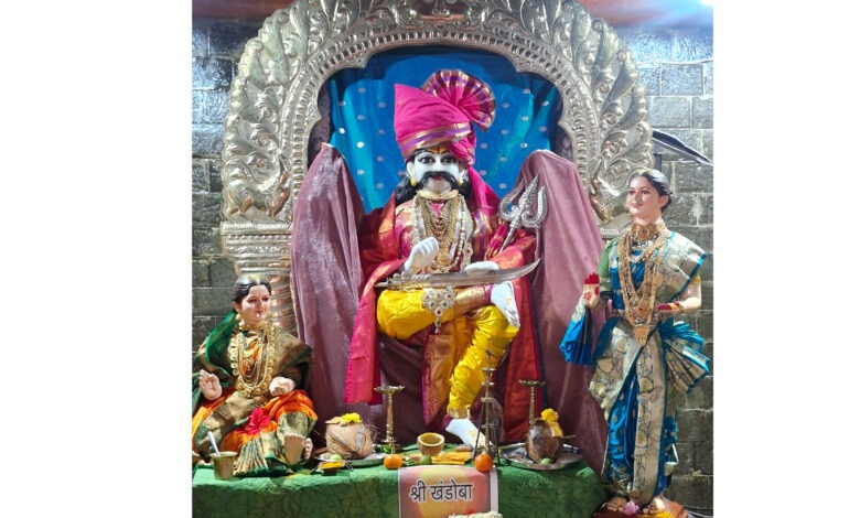 स्थैर्य, सातारा, दि. 28 सप्टेंबर : खंडोबा रूपातील दुर्गा मातेची सुरेख पूजा..सातारा शहरातील राजवाडा परिसरातील पंचपाळी दुर्गा माता मंदिर ट्रस्टच्या वतीने दुर्गा माता मंदिरात रविवारी सप्तमी तिथे निमित्त खंडोबा रूपातील दुर्गा मातेची सुरेख पूजा बांधण्यात आली होती. (छाया – अतुल देशपांडे ,सातारा)