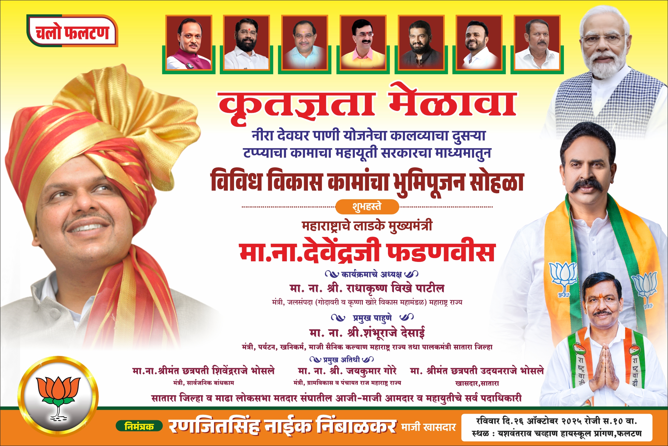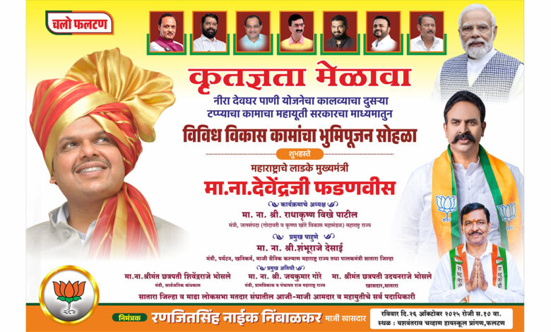 स्थैर्य, फलटण, दि. 26 ऑक्टोबर : फलटण तालुक्याच्या विकासातील महत्त्वपूर्ण टप्पा ठरणाऱ्या विविध प्रकल्पांचे भूमिपूजन आणि निरा देवघर पाणी योजनेच्या कालव्याच्या दुसऱ्या टप्प्यातील कामांचा शुभारंभ आज, रविवार, दि. २६ ऑक्टोबर रोजी राज्याचे मुख्यमंत्री देवेंद्र फडणवीस यांच्या हस्ते होणार आहे. या निमित्ताने तालुक्यासाठी भरीव निधी उपलब्ध करून दिल्याबद्दल कृतज्ञता व्यक्त करण्यासाठी माजी खासदार रणजितसिंह नाईक निंबाळकर यांनी भव्य ‘कृतज्ञता मेळाव्या’चे आयोजन केले आहे.