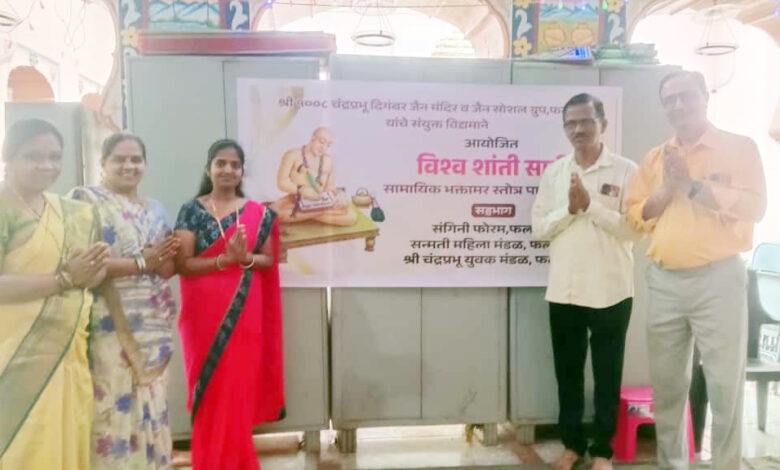 स्थैर्य, फलटण, दि. १२ ऑक्टोबर : विश्व जैन समुदायाच्या आवाहनानुसार, फलटण येथे जैन सोशल ग्रुप आणि श्री १००८ चंद्रप्रभू दिगंबर जैन मंदिर संस्था यांच्या संयुक्त विद्यमाने सामूहिक ‘भक्तामर स्तोत्र’ पठण कार्यक्रमाचे आयोजन करण्यात आले होते. हा कार्यक्रम दि. ९ ऑक्टोबर रोजी सकाळी ९ वाजून ९ मिनिटांनी येथील श्री १००८ चंद्रप्रभू दिगंबर जैन मंदिरात पार पडला.