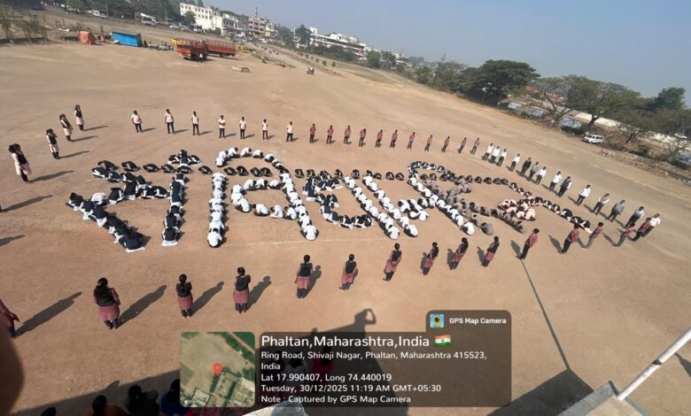 स्थैर्य, फलटण, दि. ३१ डिसेंबर : येथील श्रीराम एज्युकेशन सोसायटीच्या यशवंतराव चव्हाण हायस्कूल व ज्युनिअर कॉलेजमध्ये भारतीय संविधानाच्या अमृत महोत्सवानिमित्त सुरू असलेल्या ‘घर घर संविधान’ अभियानांतर्गत (दि. २६ नोव्हेंबर २०२५ ते २६ जानेवारी २०२६) मंगळवारी (दि. ३०) विशेष उपक्रम राबविण्यात आला. यावेळी विद्यार्थ्यांनी शिस्तबद्ध मानवी साखळीच्या माध्यमातून “संविधान दिन” हे शब्द साकारून संविधानाप्रती आदर व्यक्त केला.