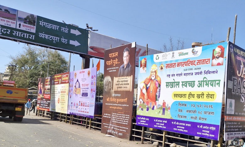 स्थैर्य, 25 फेब्रुवारी, सातारा : सध्या राजवाडा परिसरातील विविध कार्यक्रमांचे फलक लावल्याने वाहतूकीस अडथळा निर्माण झाला आहे. प्रशासनाने यावर गांभीर्याने विचार करू तातडीने यावर कार्यवाही होणे गरजेचे आहे. (छाया : अतुल देशपांडे)