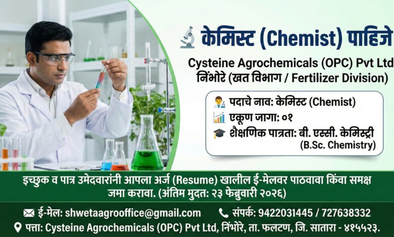 निंभोरे (ता. फलटण) येथील ‘Cysteine Agrochemicals (OPC) Pvt Ltd’ च्या खत विभागामध्ये (Fertilizer Division) खालील पद भरायचे असून पात्र उमेदवारांकडून अर्ज मागविण्यात येत आहेत.