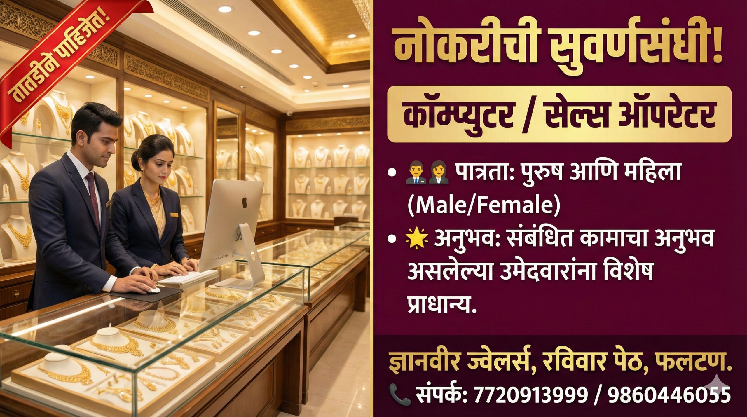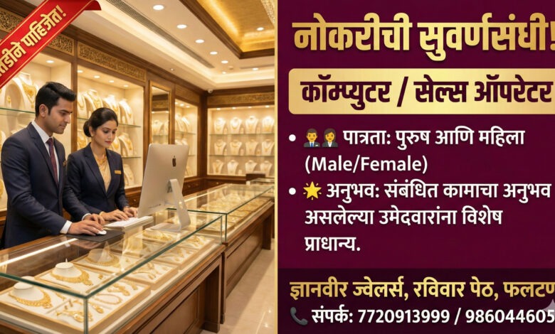 फलटण येथील रविवार पेठेतील नामांकित ‘ज्ञानवीर ज्वेलर्स’ (Dnyanveer Jewellers) मध्ये खालील पदांसाठी उमेदवारांची तातडीने आवश्यकता आहे.