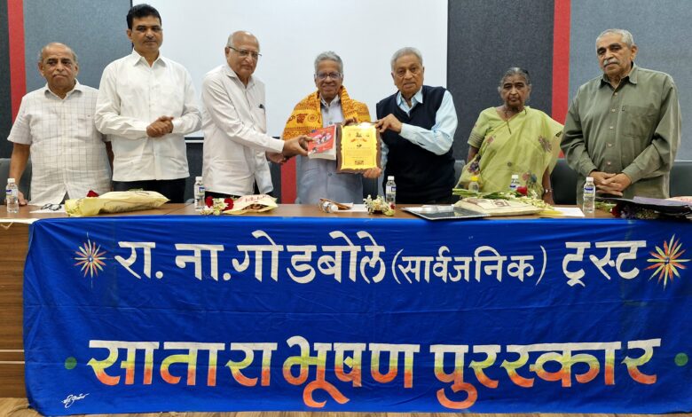 सातारा येथील रा.ना.गोडबोले सार्वजनिक ट्रस्टच्यावतीने 35 वा सातारा भूषण पुरस्कार, ज्येष्ठ शास्त्रज्ञ पद्मभूषण डॉ. ज्येष्ठराज जोशी यांना ज्येष्ठ शास्त्रज्ञ व विचारवंत दत्तप्रसाद दाभोलकर यांच्याहस्ते प्रदान करण्यात आला. याप्रसंगी रयत शिक्षण संस्थेचे संघटक डॉ. अनिल पाटील, कर्मवीर भाऊराव पाटील विद्यापीठाचे कुलगुरू डॉ.ज्ञानदेव म्हस्के, विठामाता विद्यालयाच्या माजी शिक्षिका सौ. प्रतिभाताई ताम्हणकर, गोडबोले चॅरिटेबल ट्रस्टचे विश्वस्त अशोक गोडबोले, डॉ.अच्युत गोडबोले आदी मान्यवर उपस्थित होते.