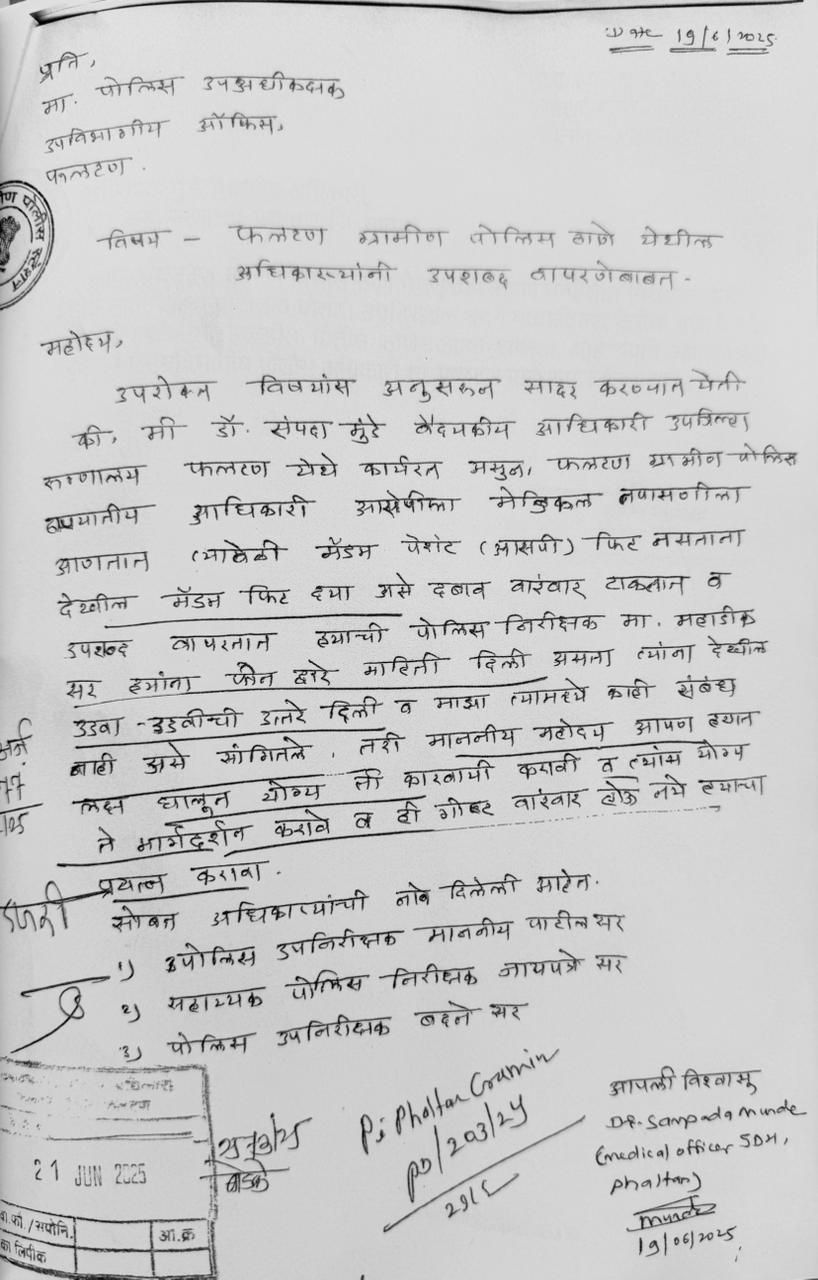 स्थैर्य, फलटण, दि. २४ ऑक्टोबर : फलटण उपजिल्हा रुग्णालयातील एका महिला वैद्यकीय अधिकाऱ्याने आत्महत्या करण्यापूर्वी सुमारे चार महिन्यांपूर्वी, १९ जून २०२५ रोजी, कामामध्ये पोलीस अधिकाऱ्यांकडून दबाव येत असल्याची लेखी तक्रार फलटणच्या उपविभागीय पोलीस अधिकाऱ्यांकडे केली होती, अशी धक्कादायक माहिती समोर आली आहे. वैद्यकीय तपासणीत अपात्र ठरलेल्या एका व्यक्तीला पात्र ठरवण्यासाठी वारंवार दबाव आणला जात असल्याचा आरोप त्यांनी या पत्रात केला होता.