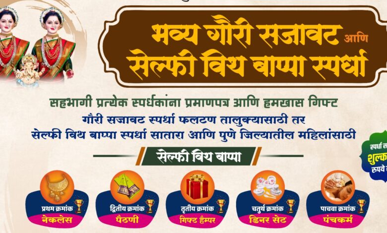 स्थैर्य, फलटण, दि. २८ ऑगस्ट : आगामी गणेशोत्सवाचे औचित्य साधून ‘रक्षक रयतेचा न्यूज’ आणि फलटणमधील विविध नामांकित संस्थांच्या संयुक्त विद्यमाने महिलांसाठी विशेष स्पर्धांचे आयोजन करण्यात आले आहे. यामध्ये फलटण तालुक्यातील महिलांसाठी ‘भव्य गौरी सजावट’ आणि पुणे व सातारा जिल्ह्यातील महिलांसाठी ‘सेल्फी विथ बाप्पा’ या स्पर्धांचा समावेश असून, या स्पर्धांना १ सप्टेंबरपासून सुरुवात होणार आहे.