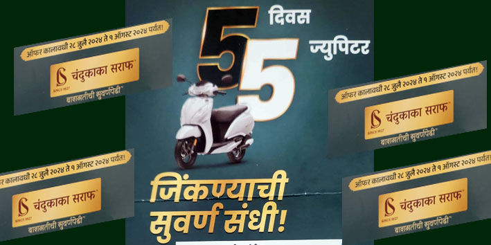 दरम्यान, फलटणमधील या शुभारंभानिमित्त ‘चंदूकाका सराफ’ सुवर्णपेढीतर्फे पाच दिवस पाच ‘ज्युपिटर स्कूटर’ जिंकण्याची सुवर्णसंधी ठेवण्यात आली आहे. रु.२०,००० पासून पुढील खरेदीवर व रु. ३,००० व पुढील गुंतवणुकीवर १ ज्युपिटर जिंकता येणार आहे. ही ऑफर कालावधी २८ जुलै २०२४ ते १ ऑगस्ट २०२४ पर्यंतच ठेवण्यात आली आहे.