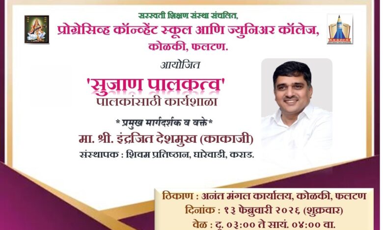 स्थैर्य, फलटण, दि. ११ फेब्रुवारी : बदलत्या काळात मुलांचे संगोपन करणे आणि त्यांचा सर्वांगीण विकास साधणे हे पालकांसमोरील मोठे आव्हान बनले आहे. याच पार्श्वभूमीवर पालकांना योग्य दिशा मिळावी, यासाठी सरस्वती शिक्षण संस्था संचलित प्रोग्रेसिव्ह कॉन्व्हेंट स्कूल अँड ज्युनिअर कॉलेज, कोळकी (Progressive Convent School, Kolki) यांच्या वतीने शुक्रवार, दिनांक १३ फेब्रुवारी २०२६ रोजी दुपारी ३.०० ते ४.०० या वेळेत ‘सुजाण पालकत्व’ (Sujaan Palakatva) या विषयावर विशेष समुपदेशन व मार्गदर्शन सत्राचे आयोजन करण्यात आले आहे.