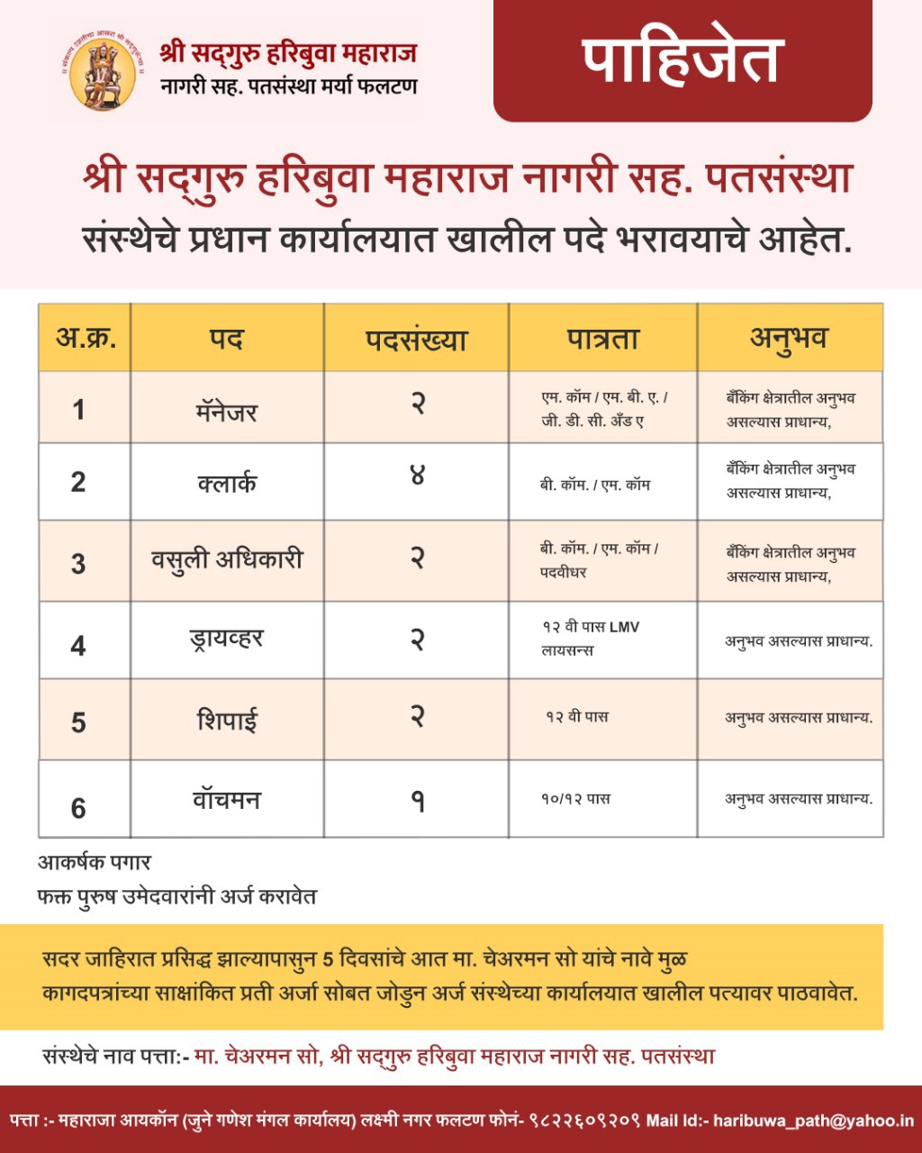 ADVT : फलटणच्या सद्गुरू पतसंस्थेत विविध पदांची जम्बो भरती