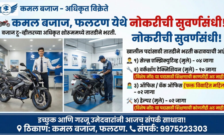 फलटण येथील बजाज टू-व्हीलरचे अधिकृत विक्रेते असलेल्या ‘कमल बजाज’ (Kamal Bajaj) यांच्या शोरूममध्ये खालील पदांची तातडीने भरती करायची आहे.
