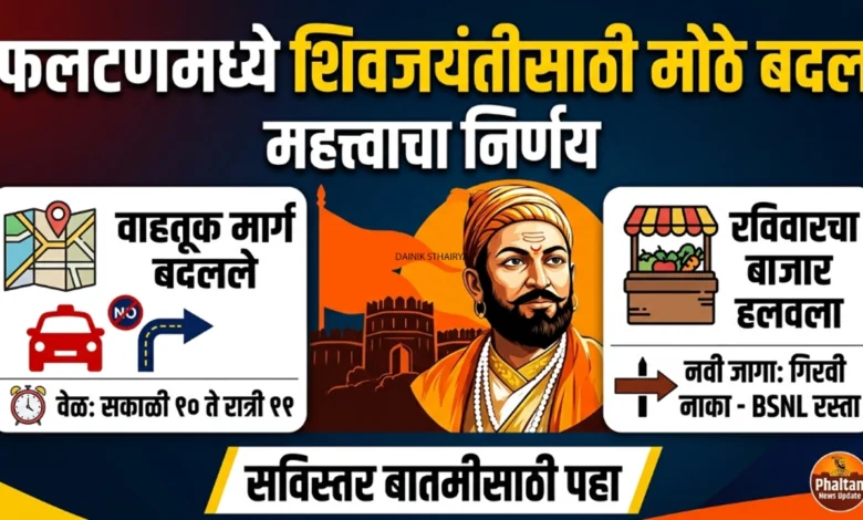 छत्रपती शिवाजी महाराज जयंतीनिमित्त फलटण शहरात प्रशासनाने महत्त्वाचे बदल केले आहेत. आज (१७ एप्रिल) ‘श्वासात राजे ध्यासात राजे’ कार्यक्रमासाठी वाहतूक वळवली असून, रविवारी (१९ एप्रिल) भरणारा आठवडे बाजार गिरवी नाका परिसरात हलवण्यात आला आहे.
