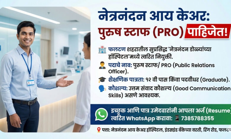 फलटण: ‘नेत्रनंदन आय केअर’मध्ये नोकरीची संधी; हॉस्पिटलसाठी पुरुष स्टाफ (PRO) पाहिजे!