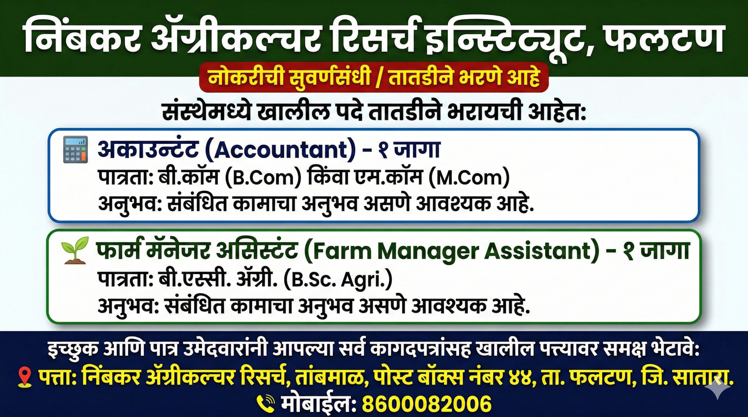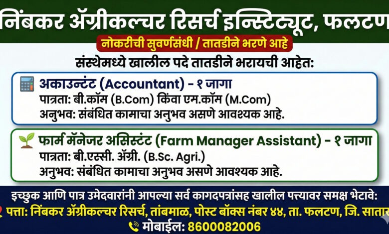 फलटण येथील सुप्रसिद्ध ‘निंबकर ॲग्रीकल्चरल रिसर्च इन्स्टिट्यूट’ (NARI) मध्ये खालील पदे तातडीने भरायची आहेत.
