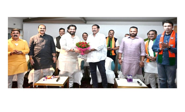 सातारा – खा. श्री. छ. उदयराजे भोसले यांचे स्वागत करताना मंत्री श्री. छ. शिवेंद्रराजे भोसले. त्यावेळी, विक्रम पावसकर, आ. मनोज घोरपडे, ना. जयकुमार गोरे, दिलीप येळगावकर, आ. अतुल भोसले.