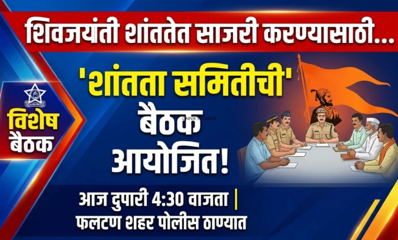 स्थैर्य, फलटण, दि. १६ एप्रिल : आगामी शिवजयंती महोत्सव शांततेत, निर्विघ्नपणे आणि मोठ्या उत्साहात पार पडावा, यासाठी फलटण शहर पोलीस प्रशासनाच्या वतीने ‘शांतता समितीची’ एक अत्यंत महत्त्वपूर्ण बैठक आयोजित करण्यात आली आहे. ही बैठक आज, गुरुवार, दिनांक १६ एप्रिल रोजी सायंकाळी ४:३० वाजता फलटण शहर पोलीस ठाण्याच्या आवारात पार पडणार आहे.