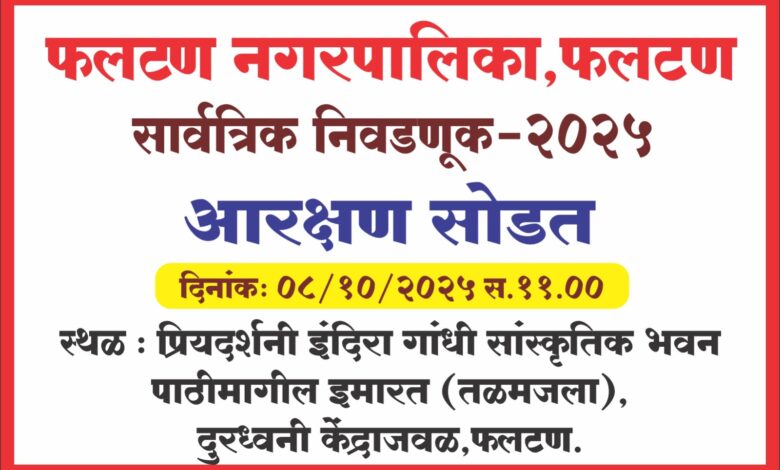 स्थैर्य, फलटण, दि. ८ ऑक्टोबर : फलटण नगरपरिषदेच्या २०२५ मध्ये होणाऱ्या सार्वत्रिक निवडणुकीसाठी सदस्यपदांची आरक्षण सोडत आज, बुधवार, दि. ८ ऑक्टोबर रोजी सकाळी ११ वाजता काढण्यात येणार आहे. येथील प्रियदर्शनी इंदिरा गांधी सांस्कृतिक भवनच्या पाठीमागील इमारतीत (बीएसएनएल ऑफिस जवळ) हा कार्यक्रम आयोजित करण्यात आला असल्याची माहिती मुख्याधिकारी निखिल जाधव यांनी एका प्रसिद्धीपत्रकाद्वारे दिली आहे.
