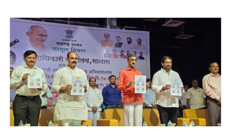 सातारा – क्युआर कोडचे लोकार्पण करताना ना. शंभूराज देसाई, त्यावेळी ना. श्री. छ. शिवेंद्रसिंहराजे भोसले, जिल्हाधिकारी संतोष पाटील, आ. मनोज घोरपडे व इतर.