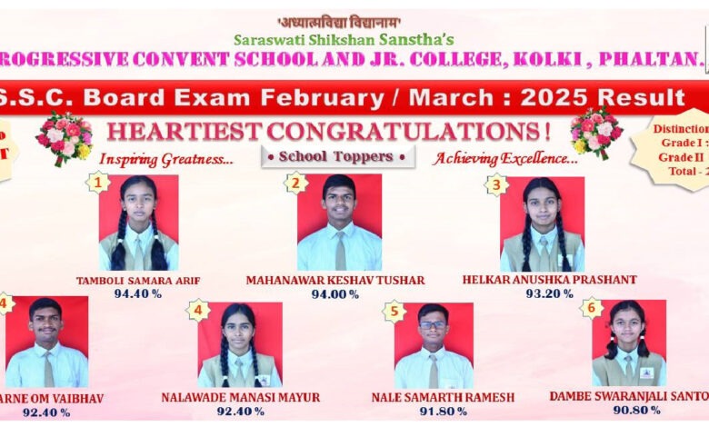 दैनिक स्थैर्य । 15 मे 2025। कोळकी । येथील सरस्वती शिक्षण संस्था संचलित प्रोग्रेसिव्ह कॉन्व्हेंट स्कूल अँड ज्युनिअर कॉलेजने इयत्ता दहावी व इयत्ता बारावी शंभर टक्के निकालाची उज्वल परंपरा कायम ठेवली आहे. प्रशालेचे इयत्ता दहावीच्या बोर्ड परीक्षेसाठी एकुण 26 विद्यार्थी बसले होते. यामध्ये विशेष प्राविण्यमध्ये एकूण 17, प्रथम श्रेणीत 08, व द्वितीय श्रेणीत 01 विद्यार्थी उत्तीर्ण झाले.
