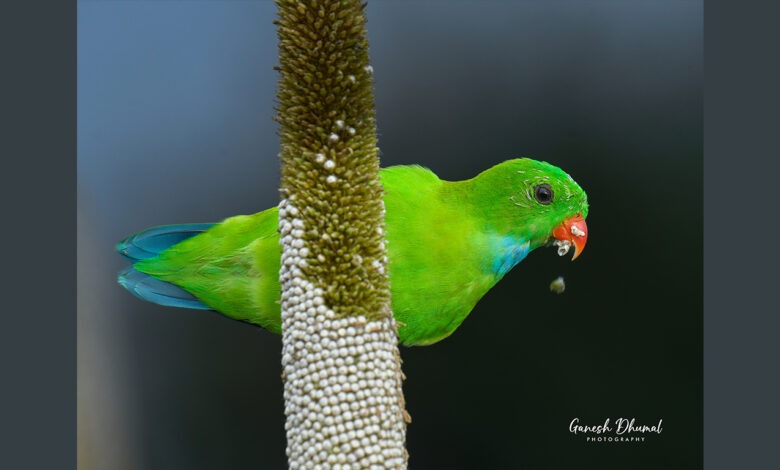 स्थैर्य, फलटण, दि. ३ ऑक्टोबर : निसर्गसंपदेने नटलेल्या फलटण तालुक्याच्या जैवविविधतेत भर टाकणाऱ्या ‘पिचू पोपट’ (Vernal Hanging Parrot) या दुर्मिळ पक्षाची नोंद झाली आहे. नेचर अँड वाइल्डलाइफ वेल्फेअर सोसायटीचे उपाध्यक्ष आणि वन्यजीव छायाचित्रकार गणेश धुमाळ यांनी आपल्या सहकाऱ्यांसह या सुंदर पक्षाला कॅमेऱ्यात कैद केले आहे.