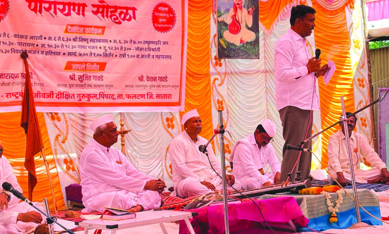 राष्ट्रबंधू राजीव दीक्षित गुरुकुल व व्यसनमुक्त युवक संघ महाराष्ट्र मध्यवर्ती कार्यालय पिंप्रद, ता. फलटण येथे शुक्रवार दि. 3 ते बुधवार दि. 7 मे दरम्यान आयोजित सामुदायिक निळोबाराय गाथा पारायण व कीर्तन महोत्सवाचा शुभारंभात ते बोलत होते. यावेळी येथे 60 फूट उंचीचा ध्वज स्तंभ उभारणी व धर्मध्वजाचे पूजन करण्यात आले. यावेळी प्रमुख पाहुणे म्हणून आ. सचिन पाटील, पंढरपूर येथील ज्येष्ठ कीर्तनकार ह.भ.प. शंकर महाराज बडवे, अॅड. आशुतोष बडवे, व्यसनमुक्त युवक संघांचे संस्थापक युवक मित्र ह.भ.प. बंडातात्या कराडकर, व्यसनमुक्त युवक संघांचे अध्यक्ष दिपक जाधव, दशरथ बोबडे, ह.भ.प. नंदकुमार कुमठेकर, सिने कलाकार भरत शिंदे, यांच्यासह पंचक्रोशीतील सरपंच, उपसरपंच, सोसायटी चेअरमन अन्य मान्यवर, ग्रामस्थ, वाचक, भाविक उपस्थित होते.