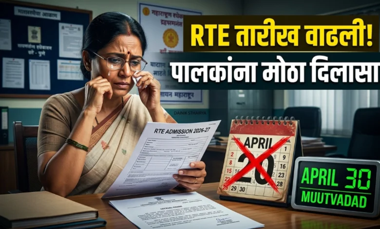 महाराष्ट्र शासनाच्या प्राथमिक शिक्षण संचालनालयाने आरटीई (RTE) २५ टक्के राखीव जागांच्या प्रवेश प्रक्रियेतील कागदपत्र पडताळणीची मुदत ३० एप्रिलपर्यंत वाढवली आहे. तांत्रिक अडचणींमुळे प्रवेश प्रलंबित असलेल्या पालकांना मोठा दिलासा.