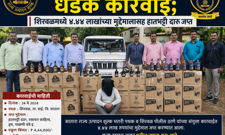राज्य उत्पादन शुल्क विभागाच्या सातारा भरारी पथकाने खंडाळा तालुक्यातील शिरवळ येथे धाडसी कारवाई करत ४२० लिटर हातभट्टी दारू आणि वाहनासह एकूण ४ लाख ४४ हजार रुपयांचा मुद्देमाल जप्त केला आहे.