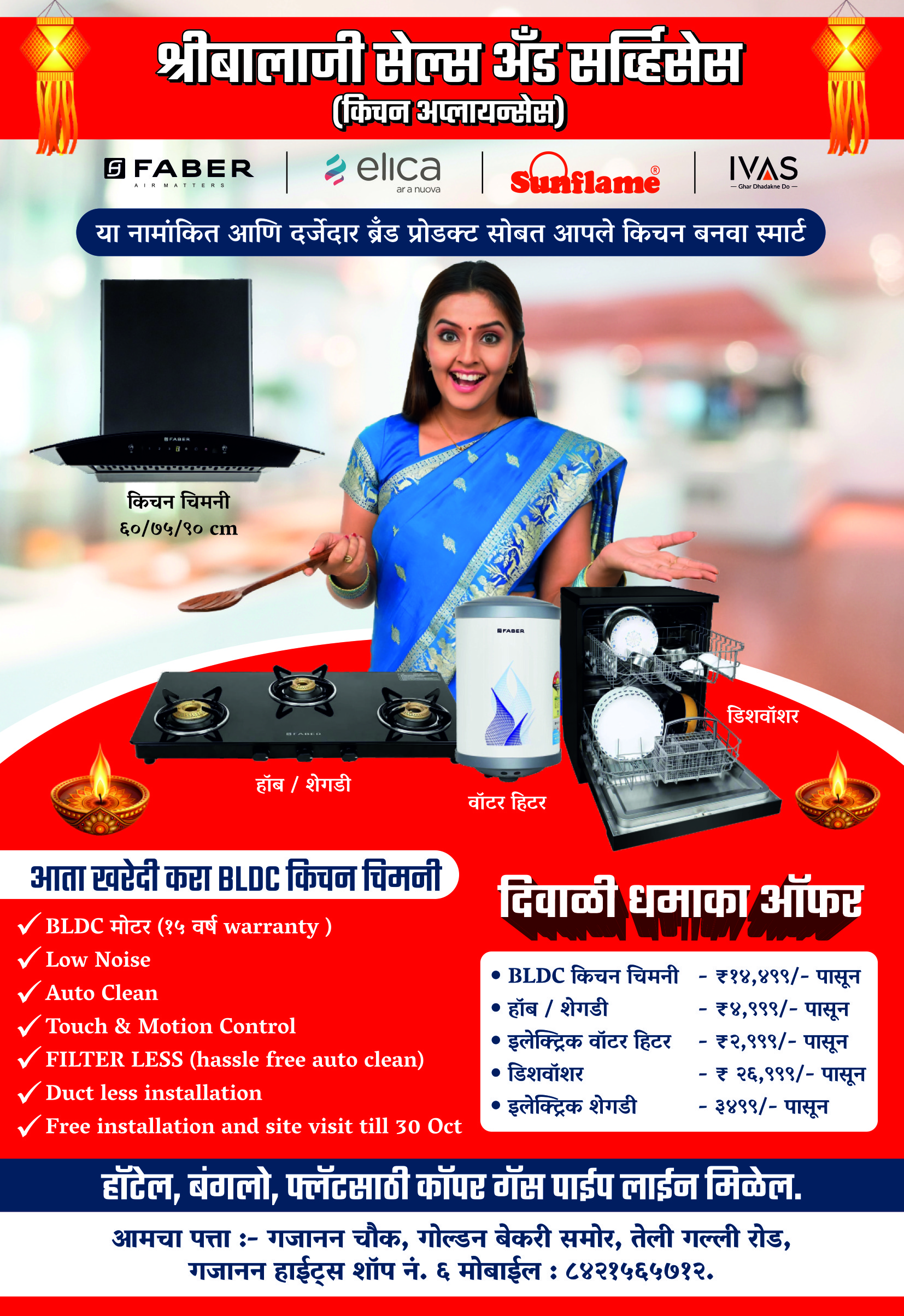 ही दिवाळी ऑफर मर्यादित कालावधीसाठी असून, तिचा लाभ घेण्यासाठी गजानन चौक येथील गोल्डन बेकरीसमोर, तेली गल्ली रोडवरील गजानन हाईट्समधील शॉप नं. ६ येथे असलेल्या ‘श्रीबालाजी सेल्स अँड सर्व्हिसेस’च्या दालनाला भेट देण्याचे आवाहन करण्यात आले आहे. अधिक माहितीसाठी ८४२१५६५७१२ या क्रमांकावर संपर्क साधता येईल.
