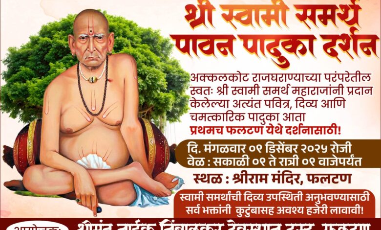 स्थैर्य, फलटण, दि. ०९ डिसेंबर : फलटणमधील स्वामी भक्तांसाठी एक आनंदाची बातमी आहे. अक्कलकोट राजघराण्याच्या परंपरेतील आणि साक्षात श्री स्वामी समर्थ महाराजांनी प्रदान केलेल्या पवित्र, दिव्य पादुकांचे दर्शन प्रथमच फलटणकरांना घडणार आहे. श्रीमंत नाईक निंबाळकर देवस्थान ट्रस्टच्या वतीने मंगळवारी (दि. ९) श्रीराम मंदिर, फलटण येथे ‘पावन पादुका दर्शन’ सोहळ्याचे आयोजन करण्यात आले आहे.