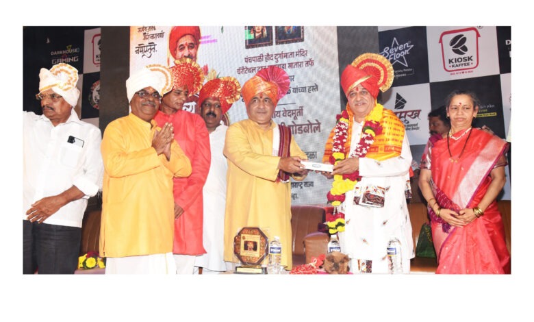सातारा – वेदमूर्ती विवेक शास्त्री गोडबोले यांचा सत्कार करताना चारुदत्त बुवा आफळे, शेजारी डावीकडून प्रशांत तुपे, धनंजय देशमुख, विनायक चिकलगे , सौ. वेदवती गोडबोले, जयंत देशपांडे. (छायाचित्र – अतुल देशपांडे)