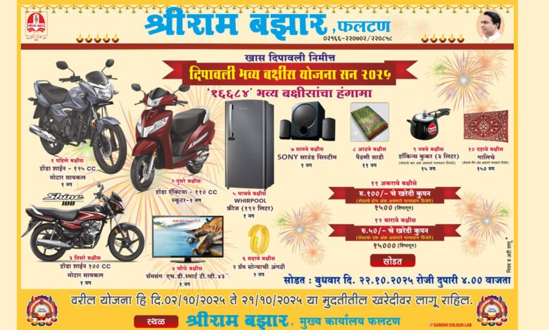स्थैर्य, फलटण : येथील श्रीराम बझारच्या वतीने दिवाळीनिमित्त भव्य बक्षीस योजना जाहीर करण्यात आली आहे. या योजनेअंतर्गत ग्राहकांसाठी एकूण १६६८ बक्षिसे ठेवण्यात आली आहेत.