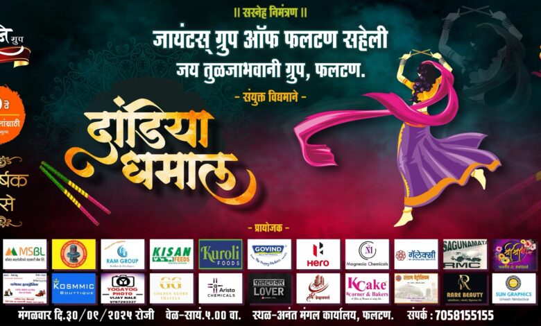 स्थैर्य, फलटण, दि. २७ सप्टेंबर : नवरात्रोत्सवाचे औचित्य साधून, फलटण शहरातील महिलांसाठी एका भव्य ‘दांडिया धमाल’ कार्यक्रमाचे आयोजन करण्यात आले आहे. राजे ग्रुप फलटण, जायंटस् ग्रुप ऑफ फलटण सहेली आणि जय तुळजाभवानी ग्रुप, फलटण यांच्या संयुक्त विद्यमाने हा उपक्रम राबवला जात आहे.