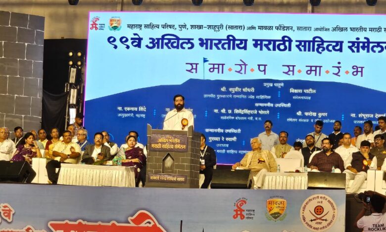 99व्या अखिल भारतीय मराठी साहित्य संमेलनाचा समारोप रविवारी (दि.4) एकनाथ शिंदे यांच्या उपस्थितीत झाला. त्या वेळी ते बोलत होते. या वेळी व्यासपीठावर उद्योग व मराठी भाषा मंत्री उदय सामंत, सातार्याचे पालकमंत्री शंभुराजे देसाई, आमदार भरत गोगावले, महेश शिंदे, संमेलनाध्यक्ष विश्वास पाटील, महामंडळाचे अध्यक्ष प्रा. मिलिंद जोशी, स्वागताध्यक्ष श्रीमंत छत्रपती शिवेंद्रसिंहराजे भोसले, कार्याध्यक्ष विनोद कुलकर्णी, कार्यवाह सुनिताराजे पवार, उपाध्यक्ष गुरैय्या स्वामी, जिल्हाधिकारी संतोष पाटील, पोलिस अधीक्षक तुषार दोशी, जिल्हा परिषदेच्या मुख्य कार्यकारी अधिकारी अश्रि्वनी नागराजन, प्रशासकीय अधिकारी अभिजित बापट, नगराध्यक्ष अमोल मोहिते, नंदकुमार सावंत आदी मान्यवर उपस्थित होते. संमेलनाचे संरक्षक, ज्येष्ठ उद्योजक फरोख कूपर यांचा तसेच व्ही. पी. परांजपे ऑटो कास्टचे व्हाईस प्रेसिडेंट ऋषिराज यांचा उपमुख्यमंत्र्यांच्या हस्ते सन्मान करण्यात आला.