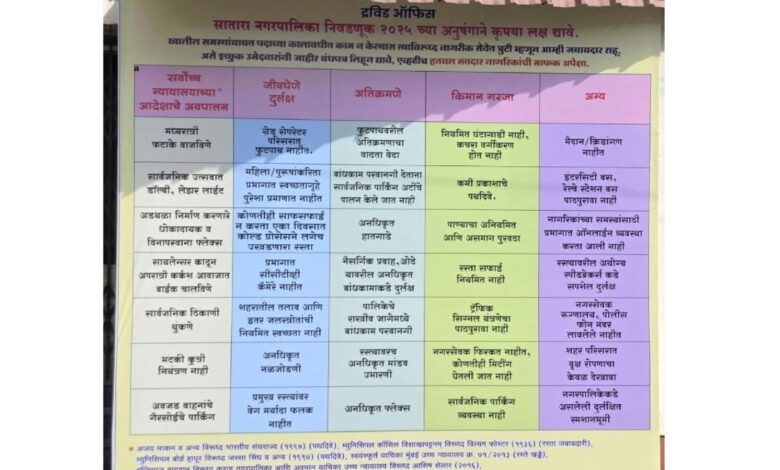 हा फलक वाचून खरोखरच अपेक्षित सुजाण लोकप्रतिनिधी निवडण्यासाठी आपण आपले बहुमोल मत दोन डिसेंबरला देणार का असाच प्रश्न पडत आहे. संपूर्ण राज्यातच नव्हे तर देशात अशा प्रकारचा योग्य निवाडा आणि त्यासाठी लोकप्रतिनिधींनी केलेली कामे याचा पाढाच प्रश्नावलीतून द्रविड परिवाराने या फ्लेक्स रुपी भव्य फलकावर छापलेला आहे. यामध्ये सर्वोच्च न्यायालयाच्या आदेशाचे अवपालन, मध्यरात्री फटाके वाजविणे, सार्वजनिक उत्सवात डॉल्बी, लेझर लाईट, अडथळा निर्माण करणारे धोकादायक व विनापरवाना फ्लेक्स, सायलेन्सर काढून अपरात्री कर्कश आवाजात बाईक चालविणे, सार्वजनिक ठिकाणी थुंकणे, भटकी कुत्री नियंत्रण नाही,अवजड वाहनांचे गैरसोईचे पार्किंग, जीवघेणे दुर्लक्ष, रोड सेपरेटर परिसरात् फुटपाथ नाहीत. महिला/पुरूषांकरिता प्रभागात स्वच्छतागृहे पुरेशा प्रमाणात नाहीत,कोणतीही साफसफाई न करता एका दिवसात कोल्ड प्रोसेसने लगेच उखडणारा रस्ता,प्रभागात सीसीटीव्ही कॅमेरे नाहीत, शहरातील तलाव आणि इतर जलस्त्रोतांची नियमित स्वच्छता नाही,अनधिकृत नळजोडणी,प्रमुख रस्त्यावर वेग मर्यादा फलक नाहीत, अतिक्रमणे, फुटपाथवरील अतिक्रमणाचा वाढता वेडा, बांधकाम परवानगी देताना सार्वजनिक पार्किन्न पालन केले जात नाही, अनधिकृत हातगाडे,नैसर्गिक प्रवाह, ओढेवरील अनधिकृत बांधकामाकडे दुर्लक्ष,पालिकेचे राखीव जागेमध्ये बांधकाम परवानगी, रस्त्यावरच अनधिकृत मांडव उभारणी,अनधिकृत फ्लेक्स,किमान गरजा,नियमित घंटागाडी नाही, कचरा वर्गीकरण होत नाही,कमी प्रकाशाचे पथदिवे.पाण्याचा अनियमित आणि असमान पुरवठा,रस्ता सफाई नियमित नाही,ट्रैफिक सिग्नल यंत्रणेचा पाठपुरावा नाही,नगरसेवक फिरकत नाहीत, कोणतीही मिटींग घेतली जात नाहीं,,सार्वजनिक पार्किंग व्यवस्था नाही,अन्यमैदान/क्रिडांगण नाहीत,इंटरसिटी बस, रेल्वे स्टेशन बस पाठपुरावा नाही,नागरिकाच्या समस्यांसाठी प्रभागात ऑनलाईन व्यवस्था करता आली नाही रस्त्यावरीलअयोग्य स्पीडब्रेकर्स कडे सपशेल दुर्लक्ष,नगरसेवक,रूग्णालय, पोलीस फोन नंबर लावलेले नाहीत.शहर परिसरात वृक्ष रोपणाचा केवळ देखावा .नगरपालिकेकडे असलेली दुर्लक्षित स्मशानभूमी सातारा नगरपालिका निवडणूक 2025 च्या अनुषंगाने कृपया लक्ष द्यावे.