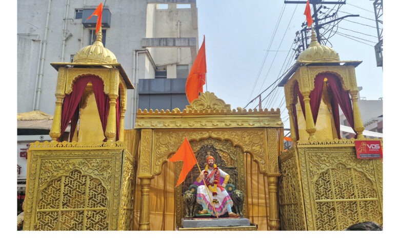 सातारा – गांधी मैदान भव्य मेघडंबरी उभारून त्यामध्ये शिवरायांचा सिंहासनावर बसलेला भव्य पुतळा. (छाया : अतुल देशपांडे)