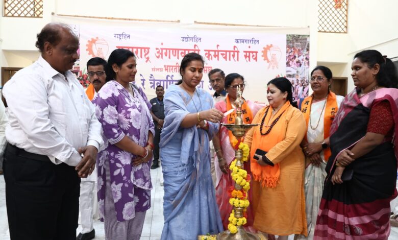 भारतीय मजदुर संघ संलग्न महाराष्ट्र अंगणवाडी कर्मचारी संघ यांचे तिसरे वार्षिक प्रदेश अधिवेशन महिला व बाल विकास राज्यमंत्री मेघना बोर्डीकर यांच्या प्रमुख उपस्थितीत लक्ष्मी नारायण मंगल कार्यालयात संपन्न झाले.