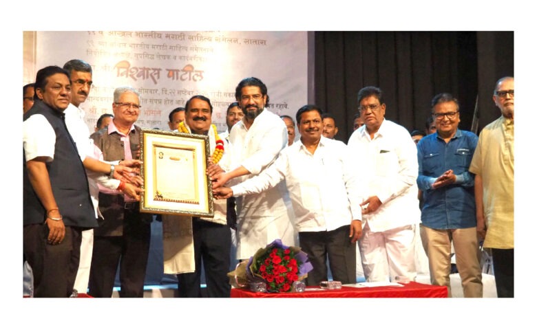 महाराष्ट्र साहित्य परिषद पुणे, शाहूपुरी शाखा, सातारा आणि मावळा फौंडेशनतर्फे जानेवारी 2026 मध्ये सातारा येथे 99 वे अखिल भारतीय मराठी साहित्य संमेलनाचे आयोजन करण्यात आले आहे. संमेलनाचे नियोजित अध्यक्ष विश्वास पाटील यांचा या निमित्ताने सोमवारी (दि.22) शाहू कलामंदिर येथे जाहीर सत्कार आयोजित करण्यात आला होता, त्यावेळी सत्काराला उत्तर देताना पाटील बोलत होते. मराठी विश्वकोश निर्मिती मंडळाचे माजी अध्यक्ष डॉ. राजा दीक्षित यांच्या हस्ते पाटील यांना गौरवण्यात आले. यावेळी विधानसभेचे उपाध्यक्ष अण्णा बनसोडे, राज्याचे पर्यटन व सातारा जिल्ह्याचे पालकमंत्री शंभूराज देसाई, सार्वजनिक बांधकाम मंत्री व संमेलनाचे स्वागताध्यक्ष छत्रपती शिवेंद्रसिंहराजे भोसले, झोपडपट्टी सुरक्षा दलाचे अध्यक्ष भगवान वैराट, संमेलनाचे कार्याध्यक्ष विनोद कुलकर्णी, कोषाध्यक्ष नंदकुमार सावंत यांची प्रमुख उपस्थिती होती. शाल, सन्मानपत्र, संमेलनाचे बोधचिन्ह, पुष्पगुच्छ आणि सातारी कंदी पेढ्यांचा हार घालून विश्वास पाटील यांचा गौरव करण्यात आला.