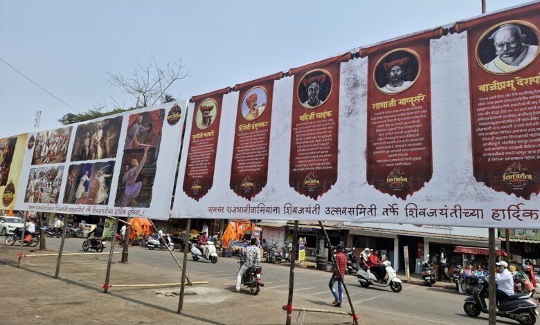 सातारा – शिवजयंतीनिमित्त शिवरायांना मदत करणारे अष्टप्रधान मंडळ व त्यांचे मावळे यांच्या विषयी माहिती देणारे फलक सातारकरांचे लक्ष वेधून घेत आहे. (छाया – अतुल देशपांडे)