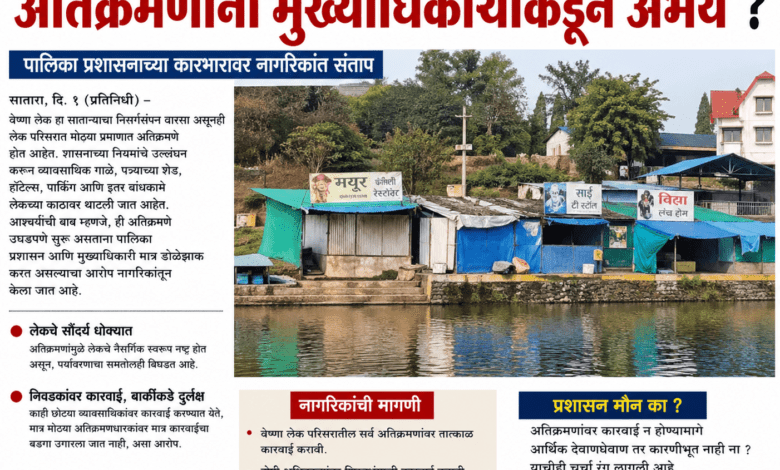 महाबळेश्वरच्या इको-सेन्सिटिव्ह झोनमधील वेण्णा लेक परिसरात नदीपात्रातील अतिक्रमणांवर कारवाई करण्यास पालिका प्रशासन टाळाटाळ करत असल्याचा आरोप होत आहे. कारवाई न झाल्यास उच्च न्यायालयात जनहित याचिका दाखल करण्याचा इशारा पर्यावरणप्रेमींनी दिला आहे.