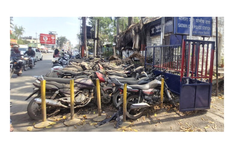 सातारा – येथील जिल्हा कारागृह आणि सातारा पोलीस ठाण्याच्या आवारात अगदी भर रस्त्यातच अनेक गुन्ह्यांमध्ये जप्त केलेली वाहने तसेच दंडात्मक कारवाई केलेली ही धूळ खात पडलेली वाहने मुख्य रस्त्याच्या परिसरातच अशी ठेवण्यात आली आहेत. या वाहनांमुळे परिसराला अक्षरशः एखाद्या अडगळीचे रूप प्राप्त झाले आहे. ही वाहनांची अडगळ पोलीस खात्याने हटवावीत. या वाहनांमुळे वाहतुकीला अडथळा निर्माण होत आहे. याबाबत लवकरच कार्यवाही दिसून येईल अशी अपेक्षा सामान्य सातारकर व्यक्त करीत आहेत. (छायाचित्र – अतुल देशपांडे, सातारा)