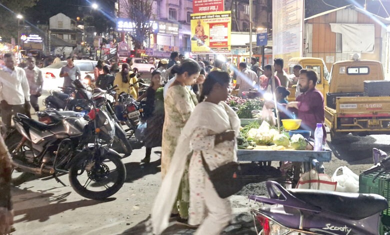 स्थैर्य, 8 मार्च, सातारा : सातारा शहरातील राजवाडा परिसरात सायंकाळी सातच्या पुढे राजवाडा बस स्थानकापुढे उभे असलेल्या या भाजी विक्रेत्यांमुळे वाहतुकीला अडथळा तर होतोच तसेच सातारकर नागरिकही तेथेच दुचाकी लावून गाडीवर बसून अगदी भाजी खरेदी करतात यामुळे वाहतुकीच्या कोंडीला येणारा अडथळा कधी दूर होणार हाच प्रश्न सामान्य सातारकर करत आहेत .(छाया – अतुल देशपांडे सातारा)
